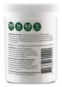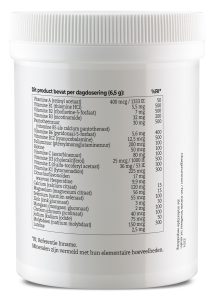 Met AOV 109 Multi Basis Poeder krijg je een zorgvuldig samengestelde mix van essentiële voedingsstoffen, zonder de toevoeging van ijzer en koper, waardoor het een uitstekende keuze is voor een breed publiek, inclusief vegetariërs. Eenvoudig te mengen met water of je favoriete drankje, maakt dit supplement een gemakkelijke toevoeging aan je dagelijkse routine.
