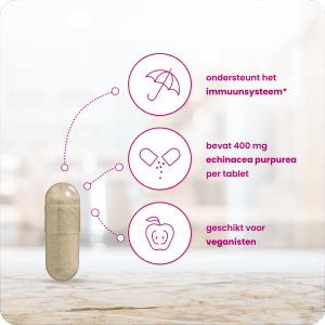 - Echinacea is een natuurlijk plantenextract dat het immuunsysteem ondersteunt, terwijl vitamine C vooral bekend staat om zijn antioxidatieve eigenschappen en eveneens de weerstand ondersteunt.