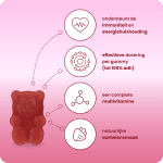 Elke gummy is zorgvuldig samengesteld met essentiële vitamines zoals A, C, D, en B-vitaminen, die bijdragen aan een sterk immuunsysteem en een gezonde energiehuishouding. Of je nu een drukke dag hebt of gewoon zorgt voor een gezonde aanvulling op je voeding, deze gummies bieden je precies wat je nodig hebt.