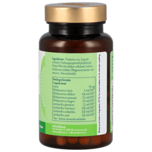 Ingrediënten: Probiotica mix, Capsuleomhulsel (Hydroxypropylmethylcellulose), Vulstof (Microkristallijne cellulose), Inuline, Antiklontermiddelen (Magnesiumzouten van vetzuren, Siliciumdioxide).