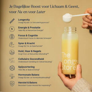 Je gezondheid is je grootste bezit – en met Longevity Complete van The Longevity Store geef je je lichaam dagelijks de ondersteuning die het verdient. Deze premium alles-in-één formule is speciaal ontwikkeld om je te helpen vitaal, scherp en energiek ouder te worden.Met slechts één schep per dag krijg je 14 wetenschappelijk onderzochte ingrediënten binnen die samenwerken om jouw energieniveau, focus, spierkracht en huidgezondheid te ondersteunen. Denk aan Nicotinamide Riboside (NR), een krachtige NAD+ voorloper, gecombineerd met onder andere creatine, astaxanthine en hyaluronzuur.Of je nu een drukke professional bent, actief sport of simpelweg gezond ouder wilt worden – Longevity Complete past moeiteloos in jouw routine. Dankzij de frisse citroensmaak is deze shake een aangenaam begin van je dag. De formule is eenvoudig op te lossen in koud water en bevat klinisch relevante doseringen van elk ingrediënt.Geproduceerd in Nederland onder strikte IFS-normen en onafhankelijk getest door Eurofins, weet je zeker dat je kiest voor kwaliteit en veiligheid. Begin vandaag nog met jouw transformatie en ervaar zelf het verschil dat The Longevity Store Longevity Complete kan maken.