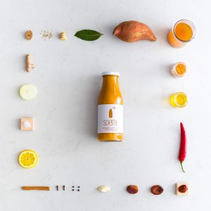 - Ingrediënten: Groentebouillon, zoete aardappel, rode ui, rode linzen, extra vierge olijfolie, gedroogde abrikozen, ras el hanout, zeezout, citroensap, knoflook, tomatenpuree, gember, zwarte peper.
