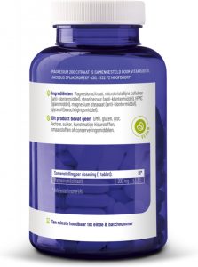 - Elke tablet bevat 200 mg magnesiumcitraat, wat bijdraagt aan de normale werking van spieren en het zenuwstelsel.