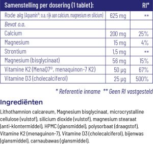- Magnesium, Silicium, Strontium: Natuurlijk verkregen uit rode alg, draagt bij aan de botdichtheid.